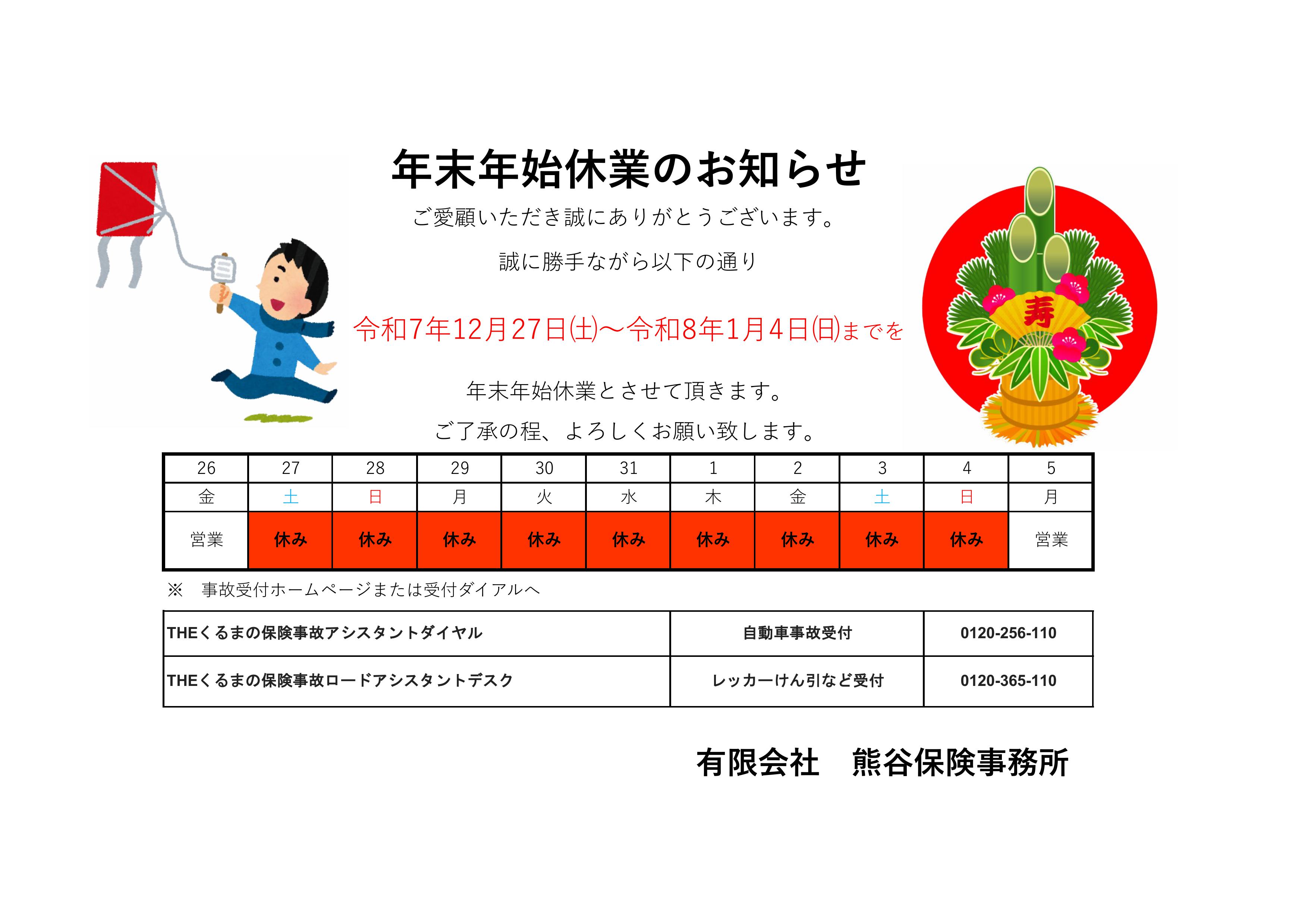 年末年始休業のおしらせ